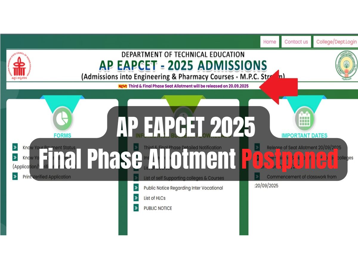 AP EAPCET 2025 Counselling: APSCHE has postponed the AP EAMCET counselling 2025 final round seat allotment result. The final phase seat allotment results will now be declared on September 20, 2025. AP EAMCET 2025 3rd and 4th round allotment results are now accessible on their official website eapcet-sche.aptonline.in.