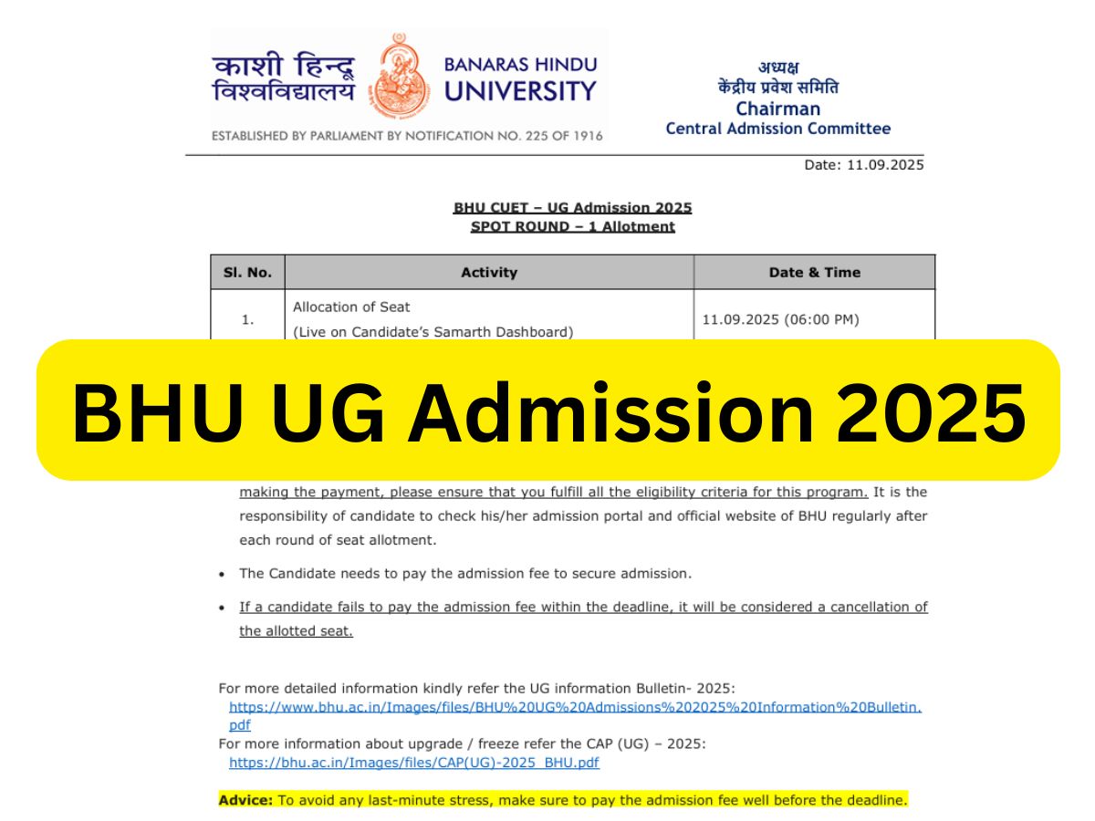 BHU UG Admission 2025: The Banaras Hindu University (BHU) has recently declared the seat allotment result for spot round 1 on September 11. Candidates can check the BHU UG spot round 1 cut off on the official website on bhu.ac.in. Candidates who have been allotted seats in spot round 1 will have to complete the payment of the admission fee online through the admission link by September 13.