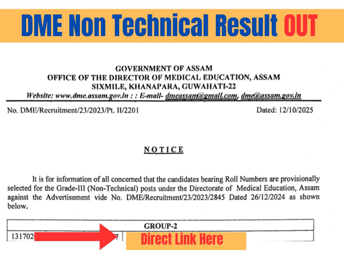DME Non Technical Result OUT: The Directorate of Medical Education, Assam has recently released the Assam DME Non Technical Result 2025 today, on 12th October 2025. Candidates who appeared for the DME Non Technical exam can now check the result PDF through the official website dme.assam.gov.in. The DME Final Result PDF for Grade-III (Non-Technical) includes roll numbers of the shortlisted candidates for multiple DME Non Technical vacancies.