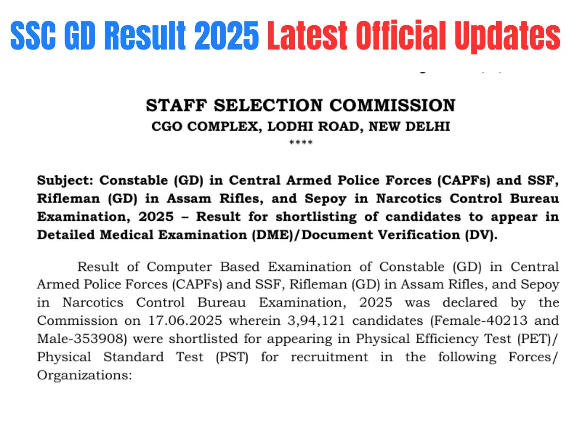 SSC GD Result 2025 OUT: The Staff Selection Commission (SSC) has released the SSC GD Result 2025 on the official website, ssc.gov.in. A total of 126,736 candidates have passed the SSC GD PET/PST Result 2025, who will proceed further with Doucment Verification and Medical Examination. Check the latest official updates on the SSC GD Result 2025.