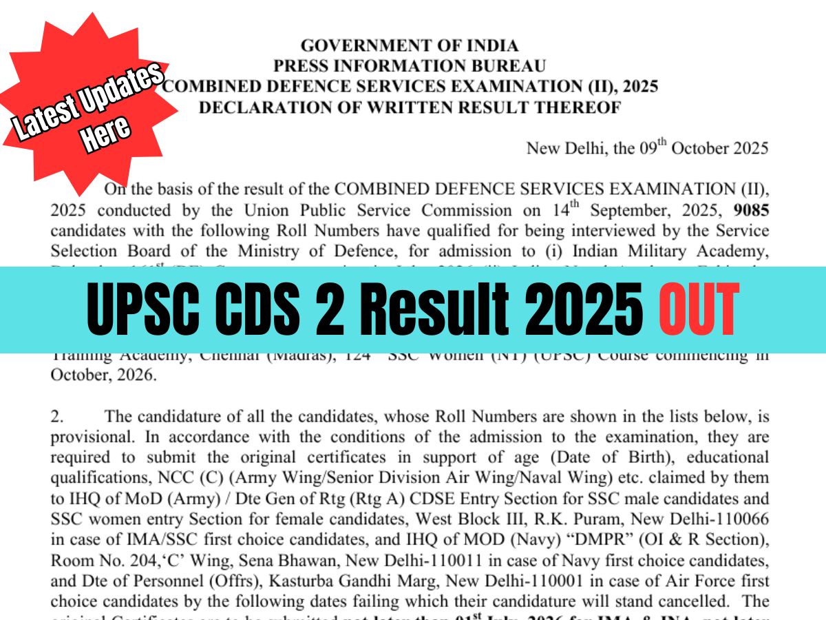 UPSC CDS 2 Result 2025 OUT: The Union Public Service Commission (UPSC) has recently released the UPSC CDS 2 Result 2025 PDF today, on 9th October 2025. Candidates who appeared for the CDS 2 2025 Exam can now check their results on the official website upsc.gov.in. UPSC CDS 2 Result 2025 PDF contains the roll numbers of the shortlisted candidates who have successfully cleared the examination. Check Latest Updates on UPSC CDS 2 Result 2025 below.