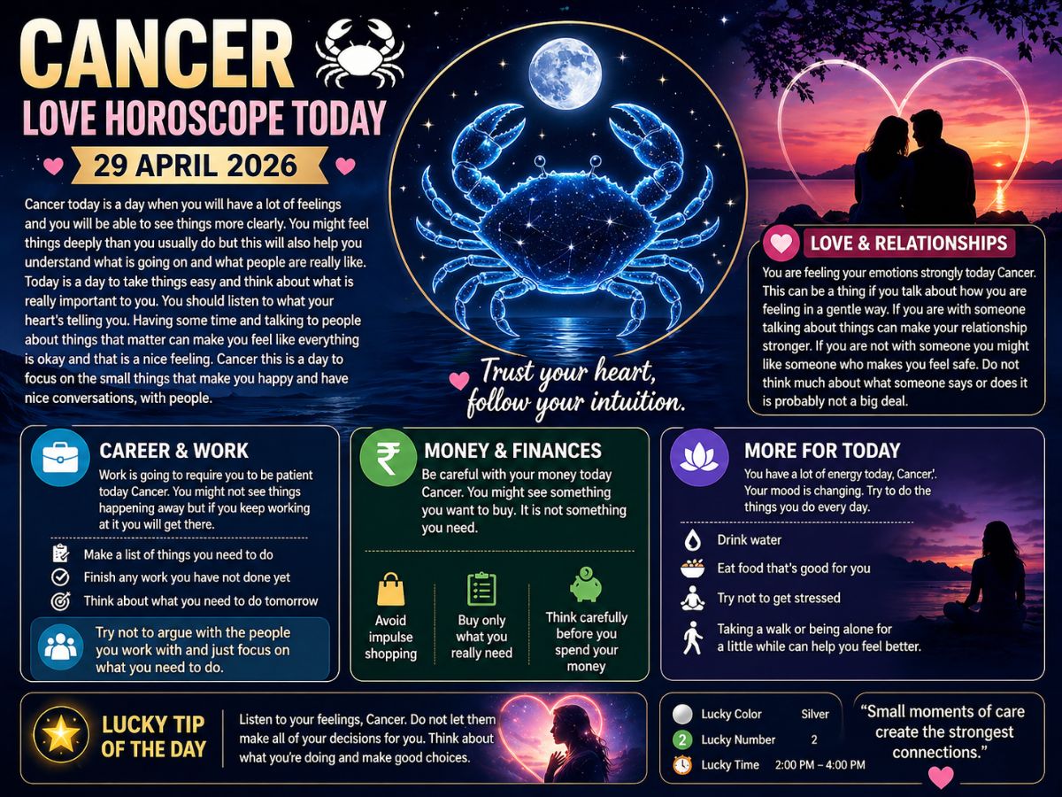 Cancer Love Horoscope Today (29 April 2026): Cancer today is a day when you will have a lot of feelings and you will be able to see things more clearly. You might feel things deeply than you usually do but this will also help you understand what is going on and what people are really like. Today is a day to take things easy and think about what is really important to you. You should listen to what your heart’s telling you. Having some time and talking to people about things that matter can make you feel like everything is okay and that is a nice feeling. Cancer this is a day to focus on the small things that make you happy and have nice conversations, with people.