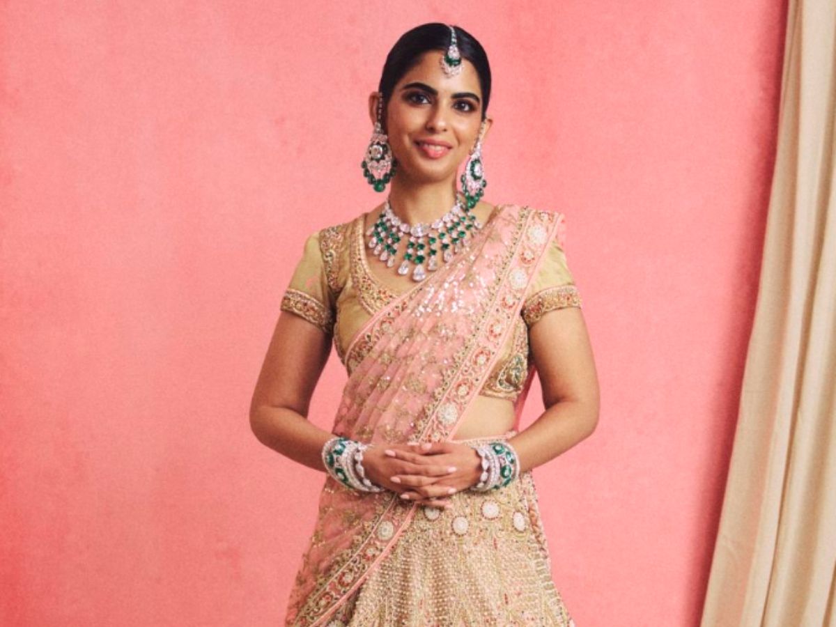 Isha Ambani was seen wearing an intricately embroidered champagne-gold and pastel pink bridal lehenga adorned with traditional motifs and delicate beadwork. The voluminous skirt was paired with a matching short-sleeved blouse featuring a plunging neckline and a bold backless design, adding a contemporary edge to the traditional silhouette.