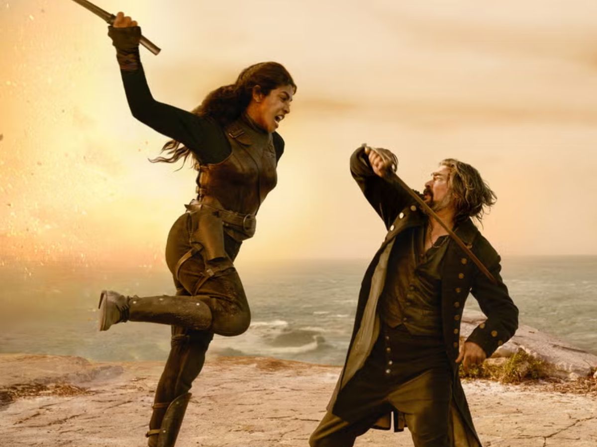 The newly released stills show Priyanka Chopra in a rugged pirate avatar, dressed in dark, battle-ready attire and captured in the middle of high-octane action. In one striking frame, she is seen mid-air, lunging forward with a weapon, her expression fierce and unyielding.