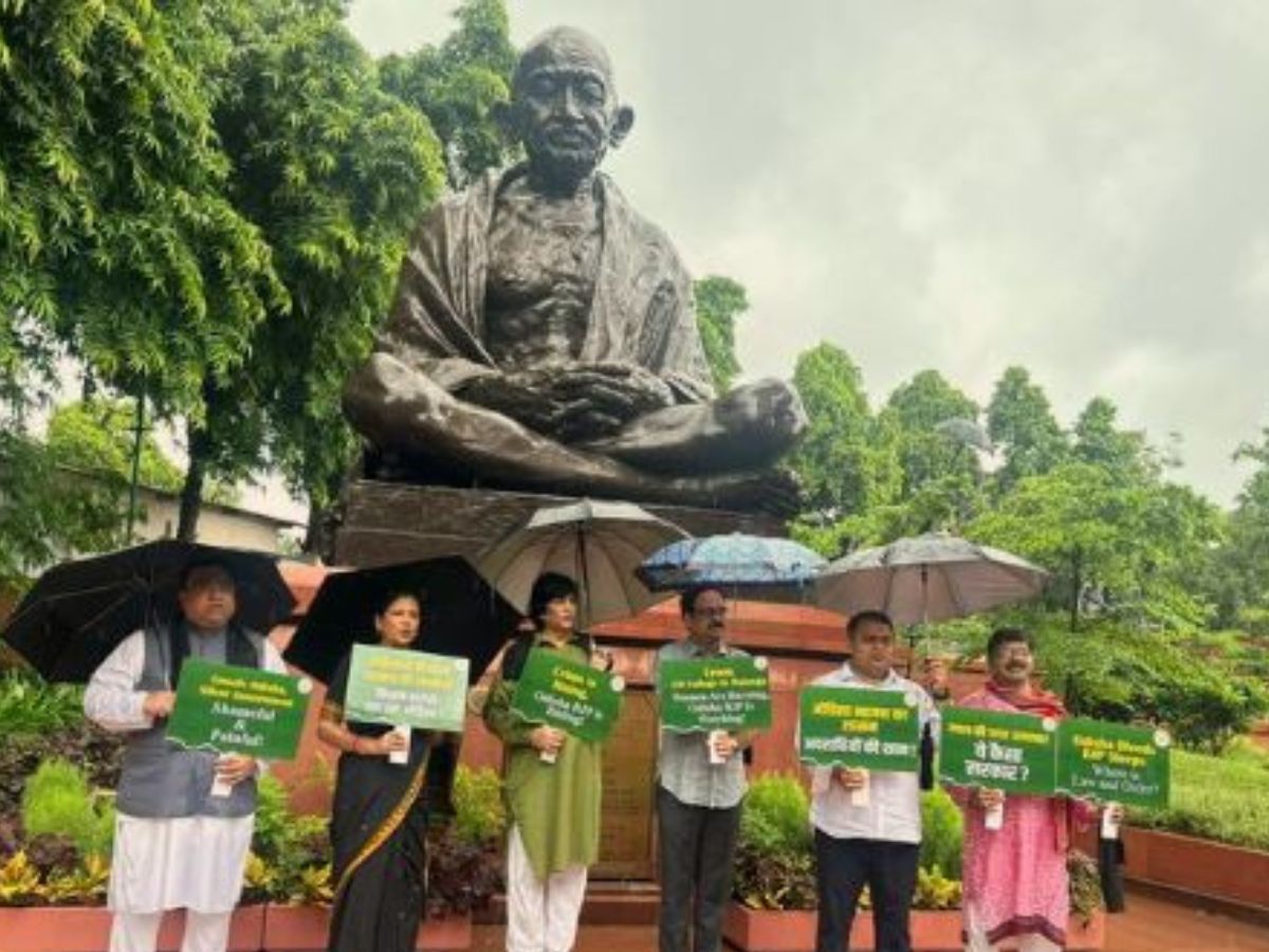 Braving the rain, the MPs gathered near the Mahatma Gandhi statue in Parliament, holding posters with messages such as “Unsafe Odisha, Silent Government” and “Shameful and Painful.”