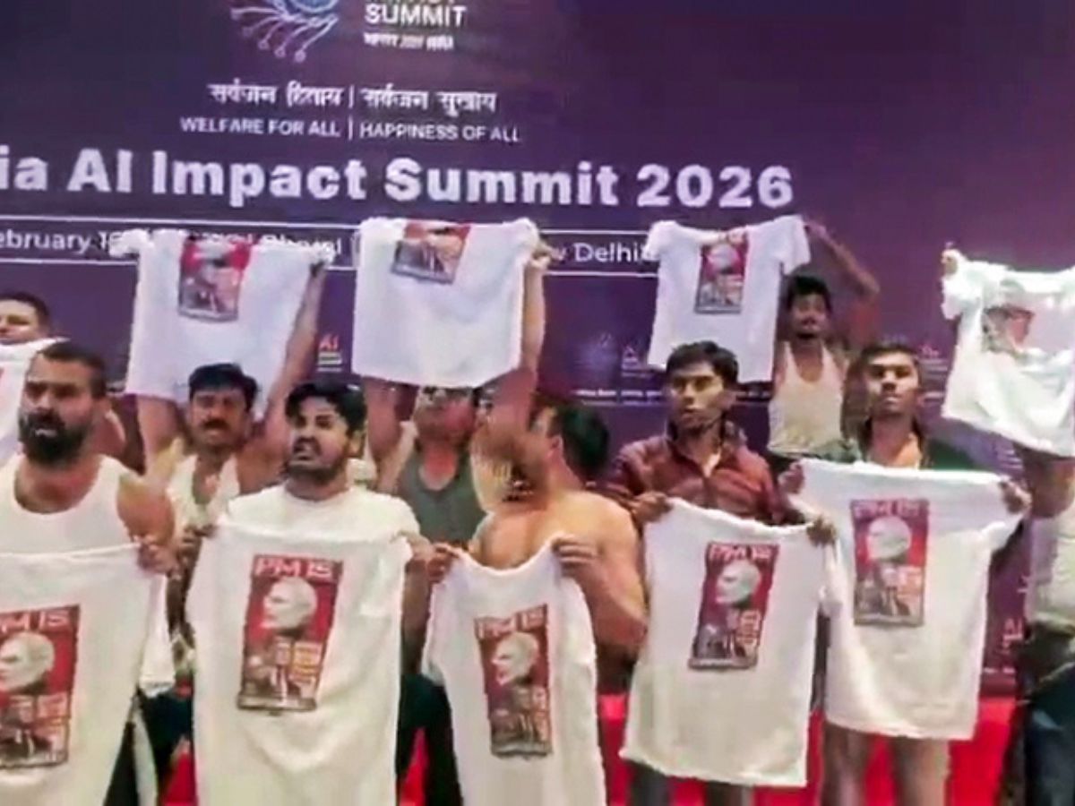 Cadres of the Indian Youth Congress on Friday staged a ‘shirtless’ protest stunt at Bharat Mandapam against Prime Minister Narendra Modi, criticising the AI Impact Summit and accusing the PM of being “compromised”.