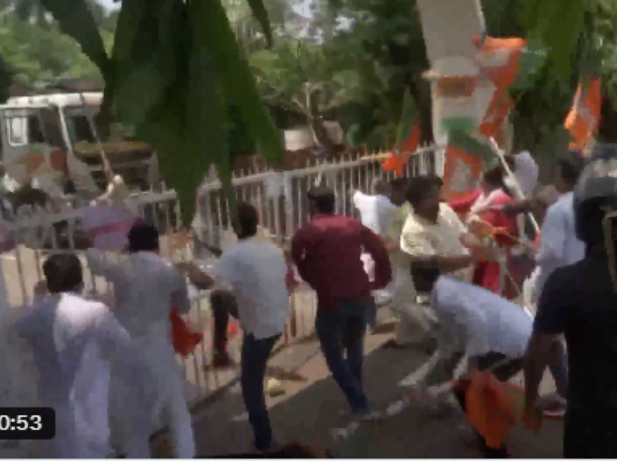 Videos showed BJP workers kicking the gates of the Congress office before entering. Soon after, members of both parties clashed outside the office, hitting each other with party flags.