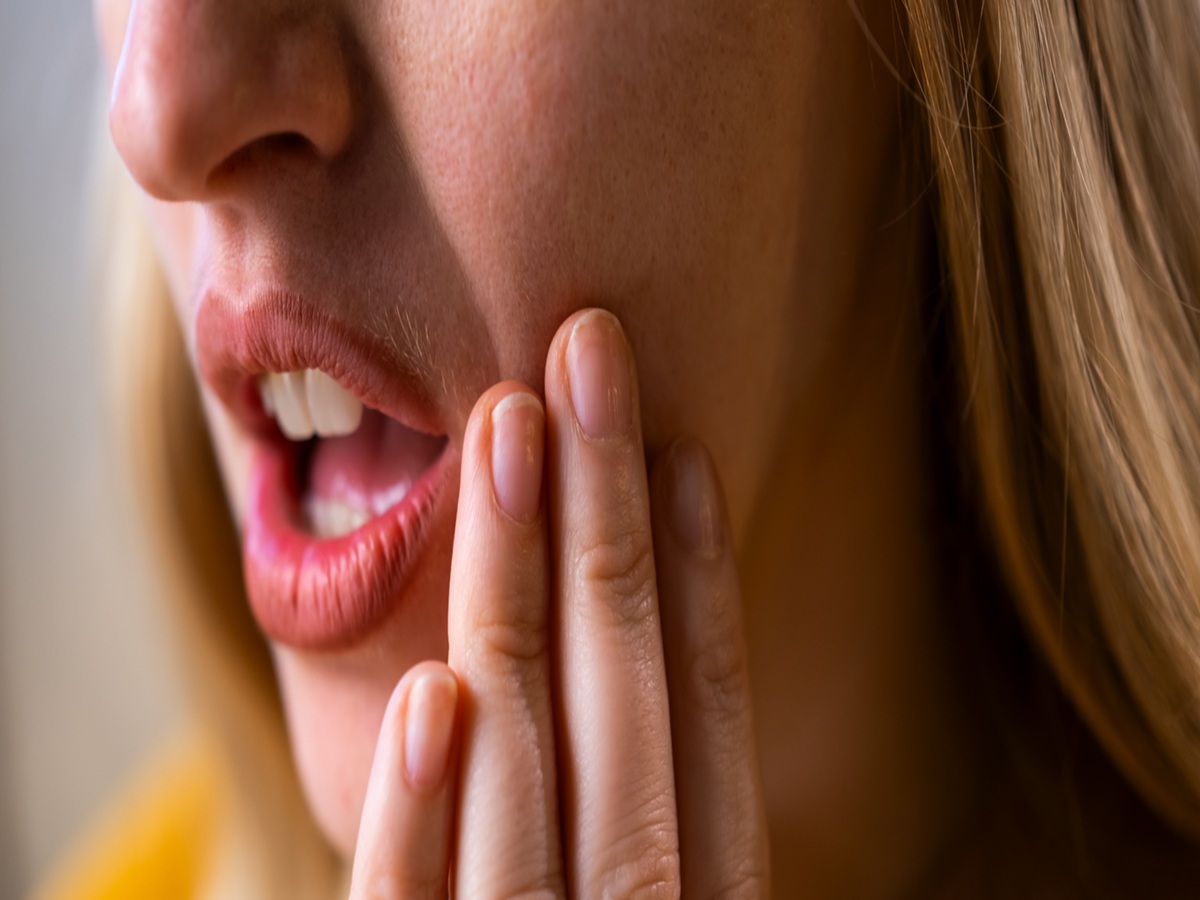 A woman holding her jaw in discomfort, illustrating gum issues and tooth sensitivity caused by hormonal changes.