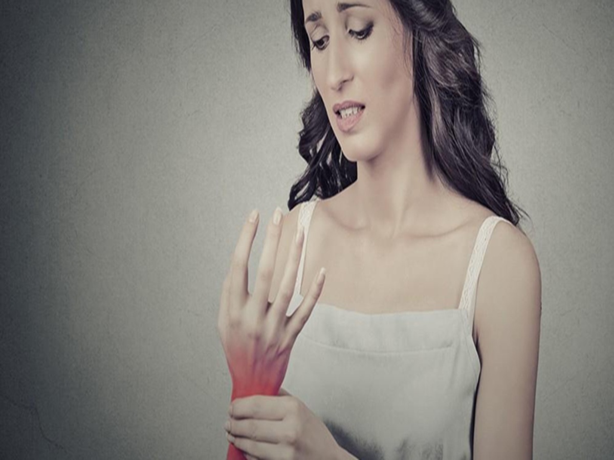 A woman holding her hand with a slight grimace, symbolizing tingling or numbness often described as pins and needles.