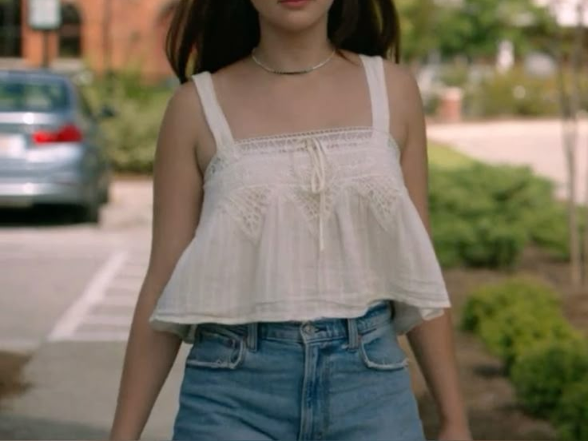 Belly wears a delicate white peplum top with lace details and a bow tie neckline, paired with high-waisted denim shorts. The outfit reflects her soft, youthful charm and captures the carefree, emotional essence of a coming-of-age summer.