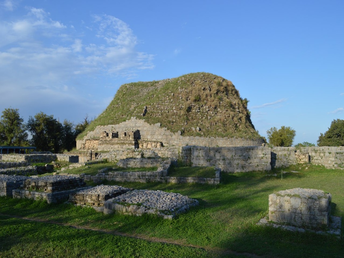A wide-angle view of the ancient ruins of Taxila, showcasing Buddhist stupas, monastery foundations, and remnants of Gandharan architecture. Once a hub of learning and spirituality, Taxila played a pivotal role in the cultural and religious evolution of early South Asia.