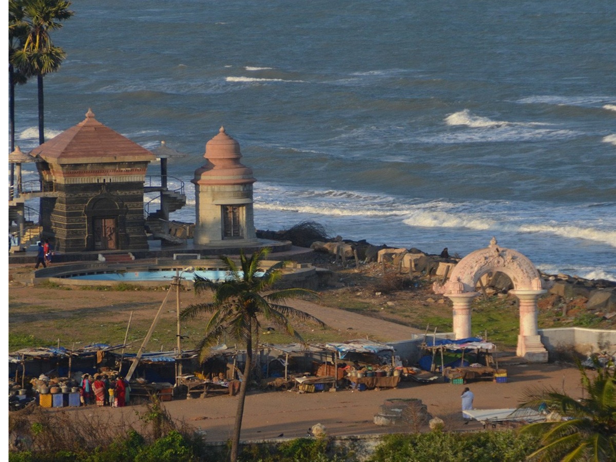 A scenic view of Poompuhar’s coastline where the Kaveri River meets the Bay of Bengal, with remnants of ancient structures and cultural landmarks. Once a thriving Chola capital and trading port, Poompuhar is now a peaceful coastal destination rich in history and heritage.