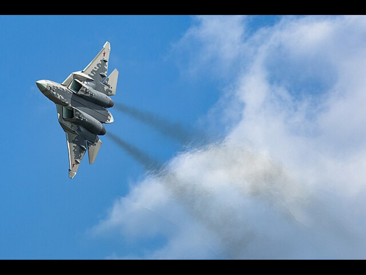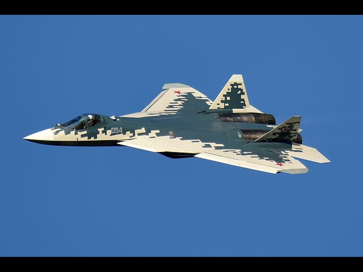 The Su-57 is a fighter jet that can fight in the air and attack targets on the ground and at sea. It has stealth features, can move very quickly and sharply, fly at high speeds without afterburners, has advanced electronics, and can carry a lot of weapons. The jet is expected to replace the MiG-29 and Su-27 in the Russian military and is also being offered for sale to other countries. (Image Credit - Wikipedia Commons)