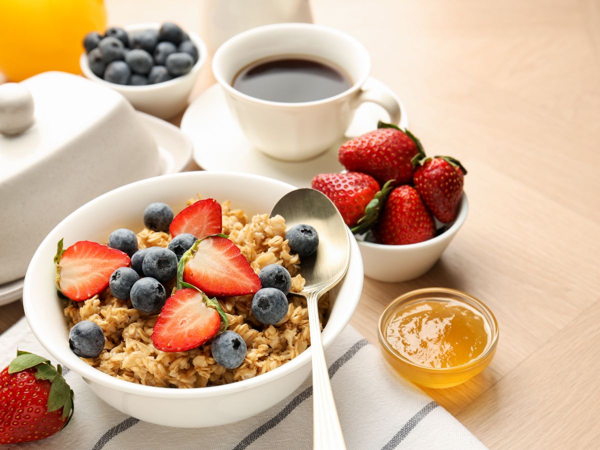Oats porridge with nuts and fruits is a great slow-digesting option that releases energy gradually and keeps you full for longer hours.