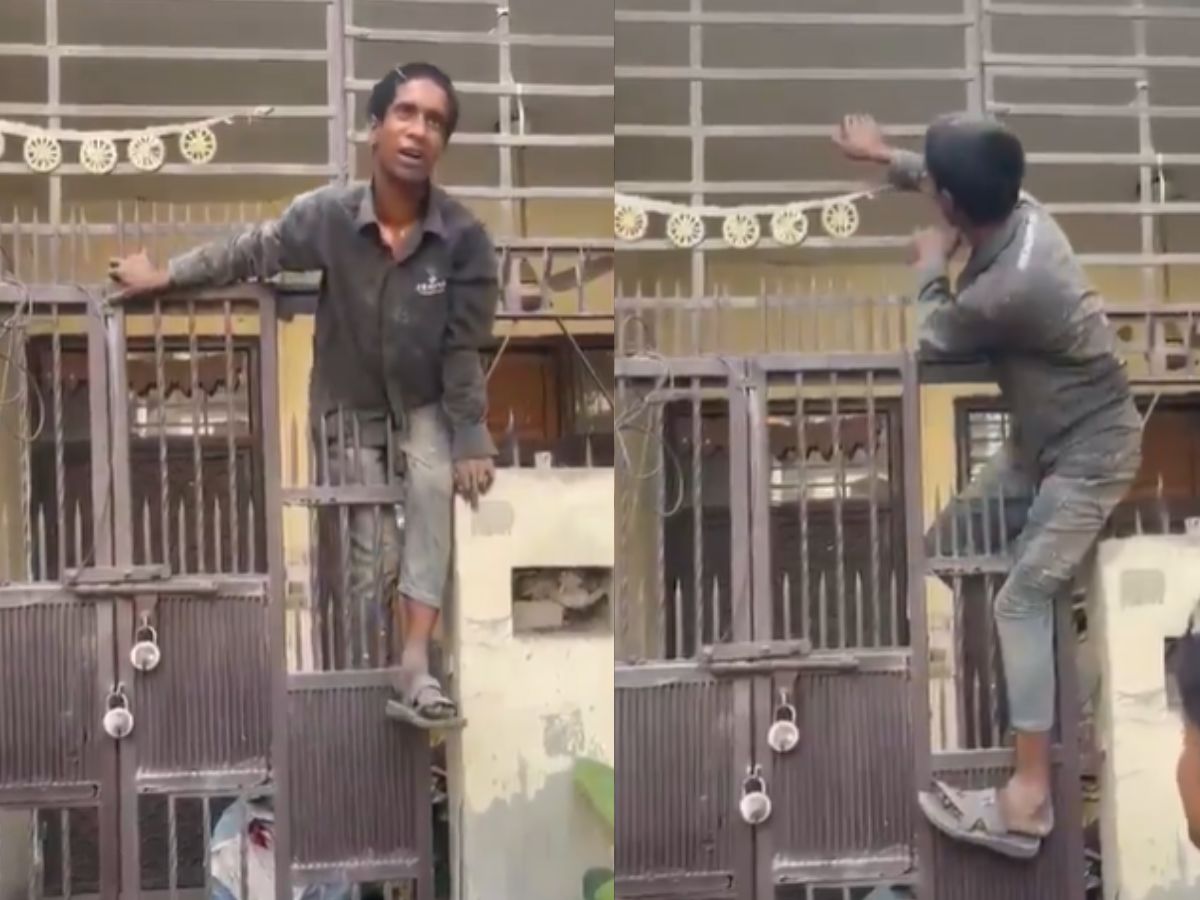 A thief in Ghaziabad got stuck on sharp gate bars while fleeing after a break-in. Locals quickly apprehended him and handed him over to Shalimar police.#Ghaziabad #ShalimarPolice #Thief #Trapped #CrimeNews #ViralVideo #NewsX pic.twitter.com/xQWLgc7CFt