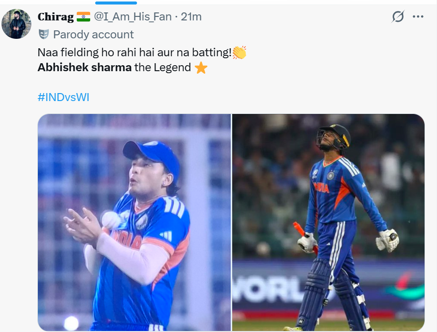 Abhishek sharma the Legend ⭐️#INDvsWI pic.twitter.com/5Irq2TQ1EV— 𝐂𝐡𝐢𝐫𝐚𝐠 🇮🇳 (@I_Am_His_Fan) March 1, 2026