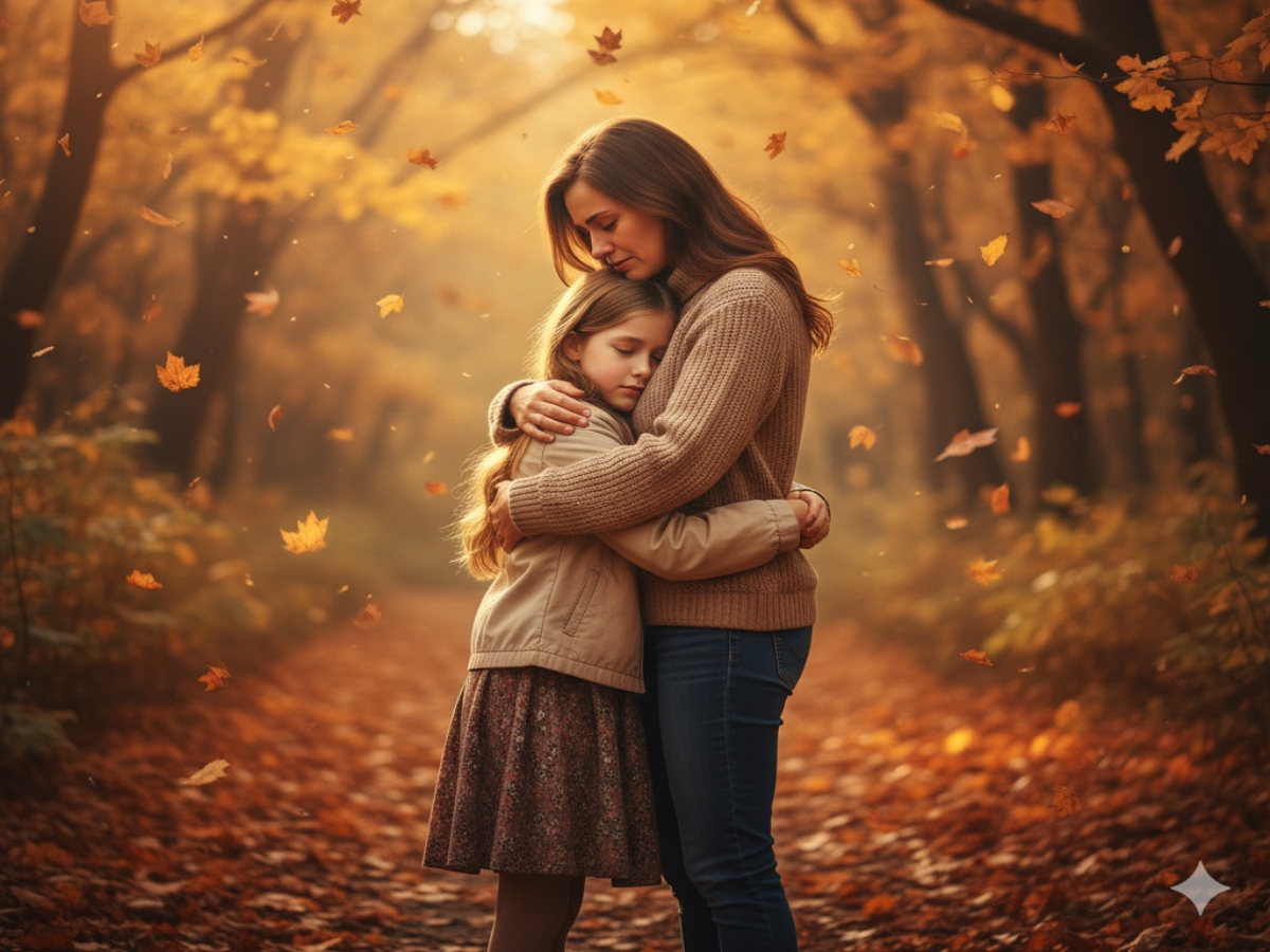 – A realistic photo of present me embracing my younger self beneath autumn trees, golden leaves falling softly, warm evening glow, nostalgic and deeply moving.