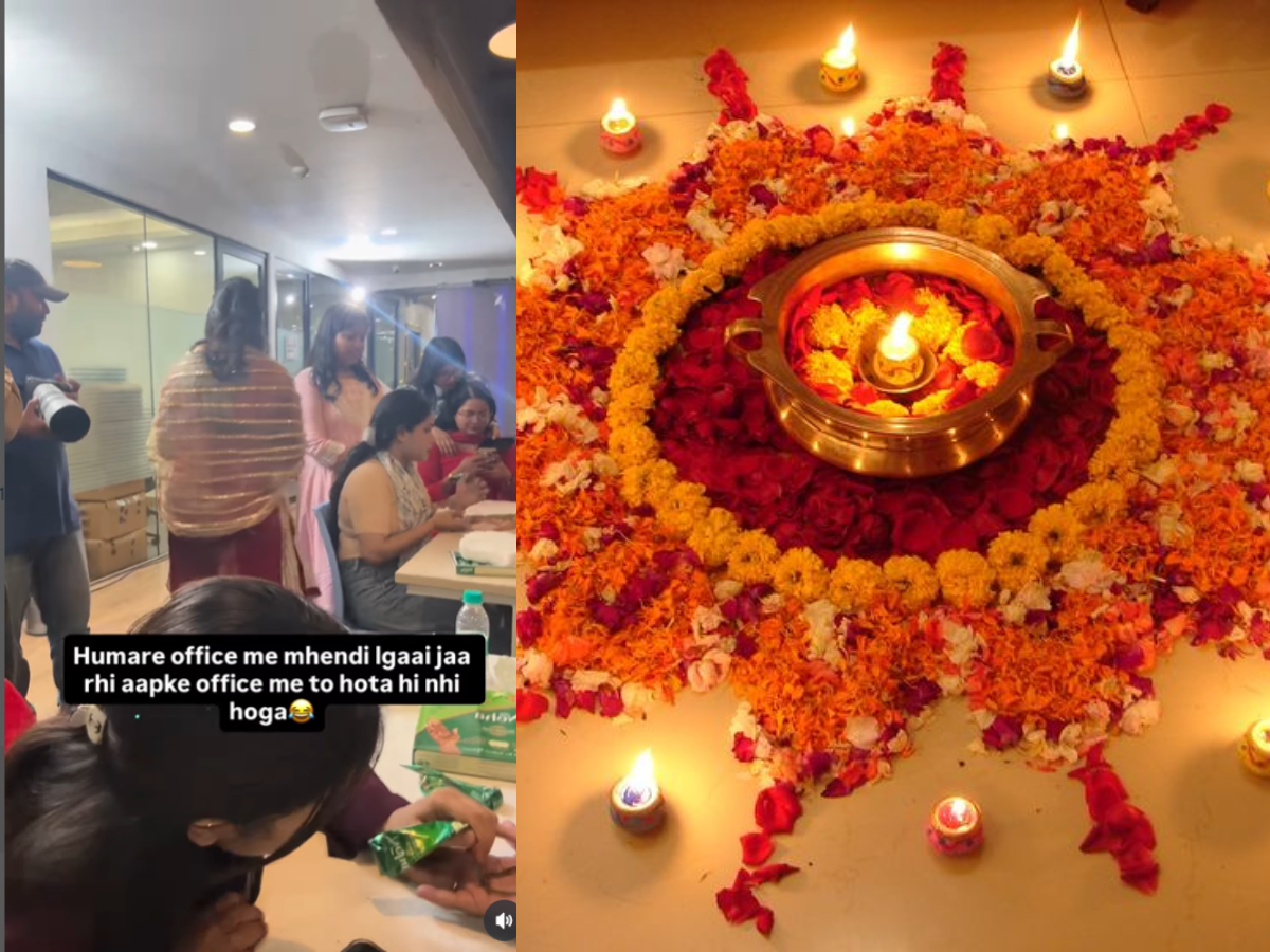 In one viral Instagram video, an office organised a Mehendi application competition as part of its Diwali celebration. The video shows employees enthusiastically applying intricate Mehendi designs on each other’s hands, turning the workspace into a festive zone.