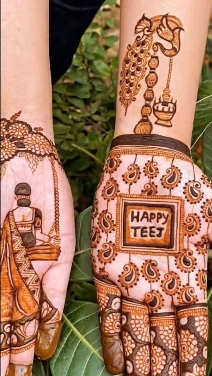 Mehndi Design With Teej Written on it with floral and netted design which will cover the whole palm.