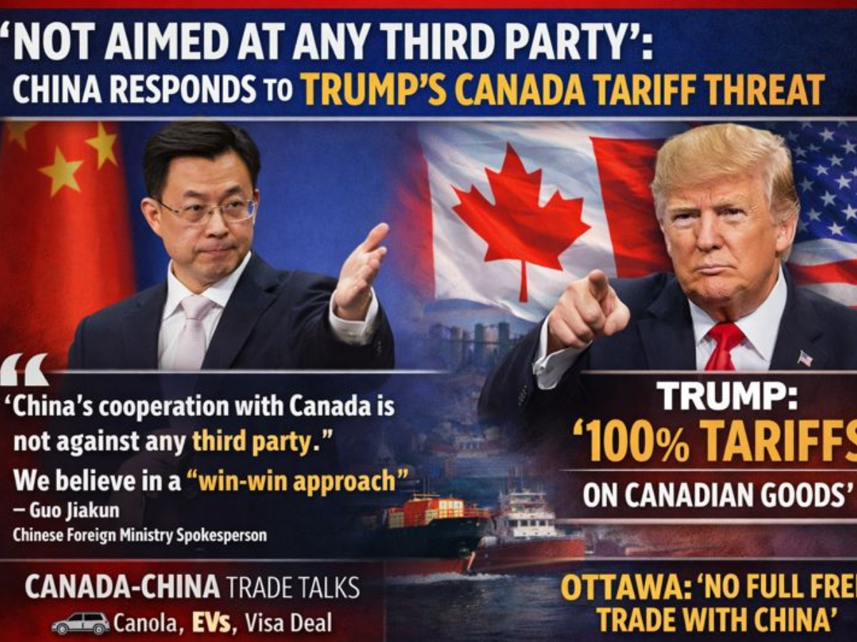 China on Monday made its position clear after US President Donald Trump threatened to slap 100% tariffs on Canada over its growing trade engagement with Beijing. China said its talks with Canada are not aimed at the United States or any other country and should not be dragged into political fights.