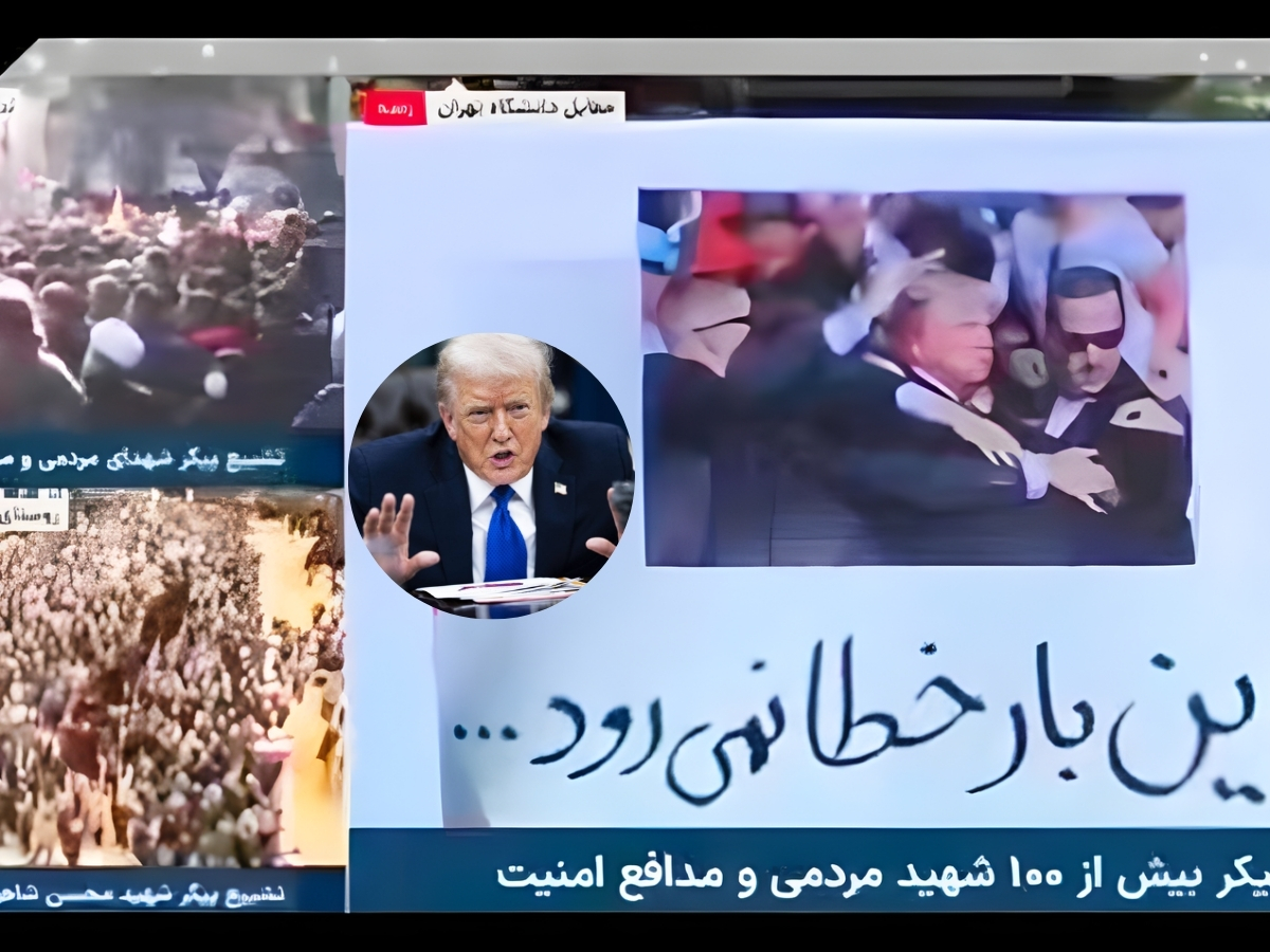 Israeli-American journalist Emily Schrader shared a screenshot of a tweet showing Iranian state TV’s broadcast. The image featured a split screen: a crowd on the left and a photo of Trump on the right. A message in Persian warned: “This time, the bullet won’t miss.”