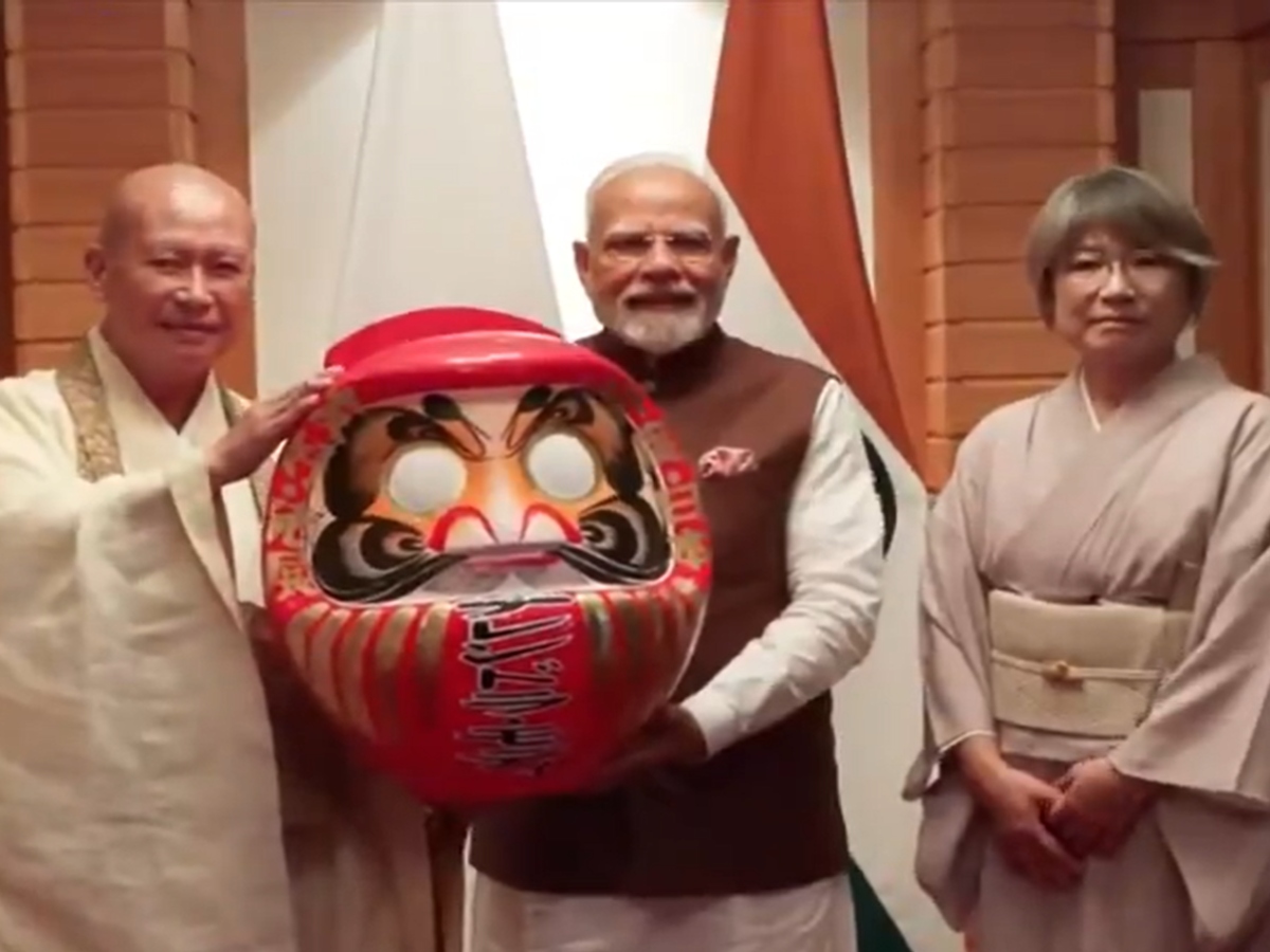 Prime Minister Narendra Modi was presented with a Daruma doll, a traditional Japanese doll symbolising good luck, by the Chief Priest of Shorinzan Daruma-Ji Temple in Tokyo.